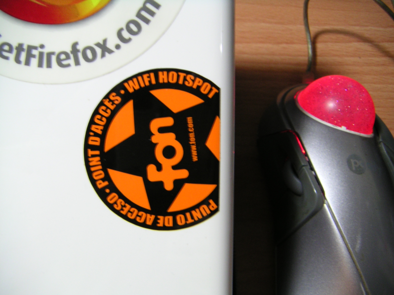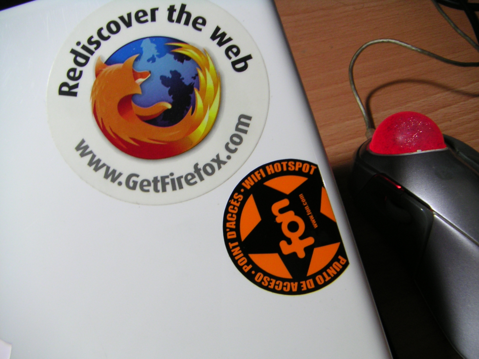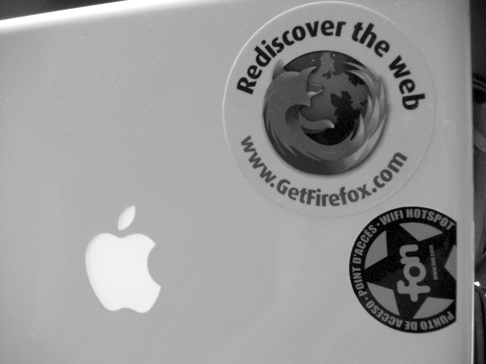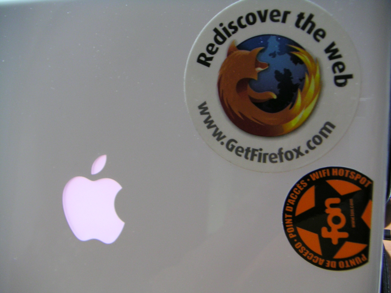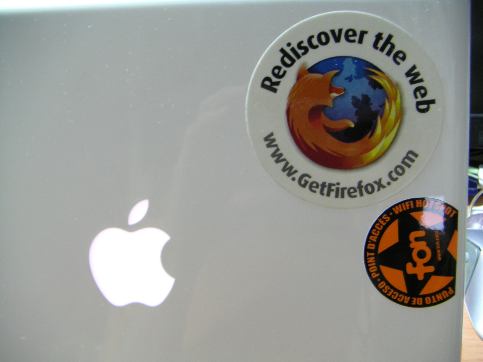 iBook 上的 Fon 貼紙 2007年1月21日 來源:blogger 原文連結 因為 這個 的關係,照了幾張Fon貼紙貼在小白上的照片。 照的太黑了,乾脆轉成黑白的,也蠻漂亮。 Fon跟Firefox是好鄰居,兩人都住在發光的蘋果旁。 亮一點的照片。 特寫一下Fon貼紙。 跟Firefox與小紅球再來一張合照。