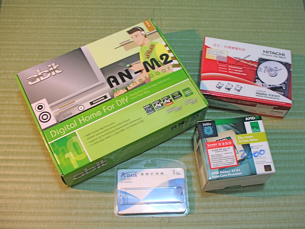 新配備:abit AN-M2 主機板、Socket AM2 的 AMD X2 3600+、AData 的 DDR2-800 1G 記憶體。
