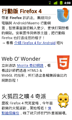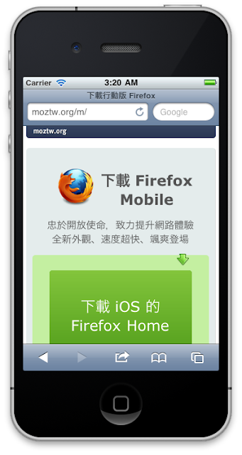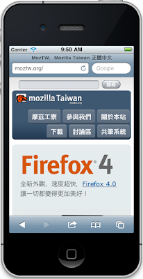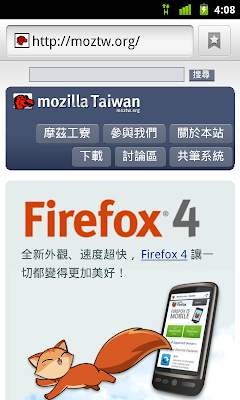 除了行動版頁面外,對應 Mozilla 的 http://mozilla.con/m,三月底時 CQD 也製作了 http://moztw/m ,作為行動裝置的 Firefox 快速下載頁。