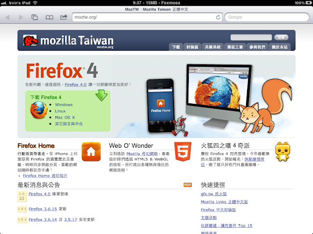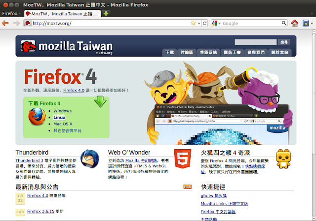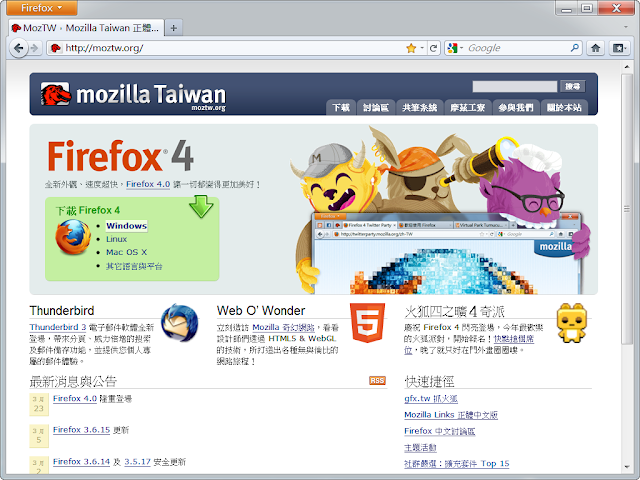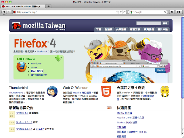 隨著 Firefox 4 的上市,這次 MozTW (Mozilla Taiwan) 的首頁有了一些新的設計,成果目前已經上線;在上週日的 Firefox 4 Party 上半場的小科展中,藉由插花小B 的攤位,我也有小小的展示了一下 MozTW 首頁的各種樣貌。