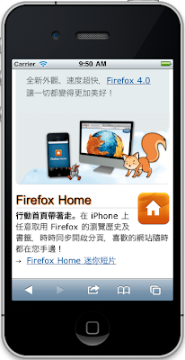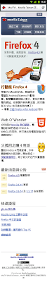 行動版型中,除內容各欄的排列外,正中央主要產品欄的主圖與最上方 Banner 上的導覽按鈕也透過 CSS 調整大小與排列。此外,在 iOS 及 Android/Maemo 等行動裝置上,提供桌面版 Firefox 4 的安裝檔下載是無用、不合理、且容易讓一般用戶混淆的事,因此我們也直接把「下載 Firefox 4」框框隱藏起來了。