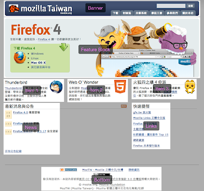 MozTW 網站所使用的佈景從 2004 年沿用至今,除了一些諸如 CSS 圓角、頁面寬度的調整以外,一直沒什麼變化。是有點一成不變,不過倒是出現了一個意外的優點—這個佈景是以欄為主的版面,最上方是 Banner、中間有主要產品欄、接著有三個項目並排、再下方則是最新消息與快速捷徑,最下面則是版權資訊等,全部合計有八個欄位。