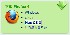 最早 Piaip 所製作的 MozTW 網站首頁,早已有偵測透過瀏覽器 User Agent 偵測作業系統的機制,首頁的下載框中,使用者所用的平台會高亮突起,幫助使用者選擇下載的 Firefox 版本(如下圖),不過這個機制已經壞了好幾年。