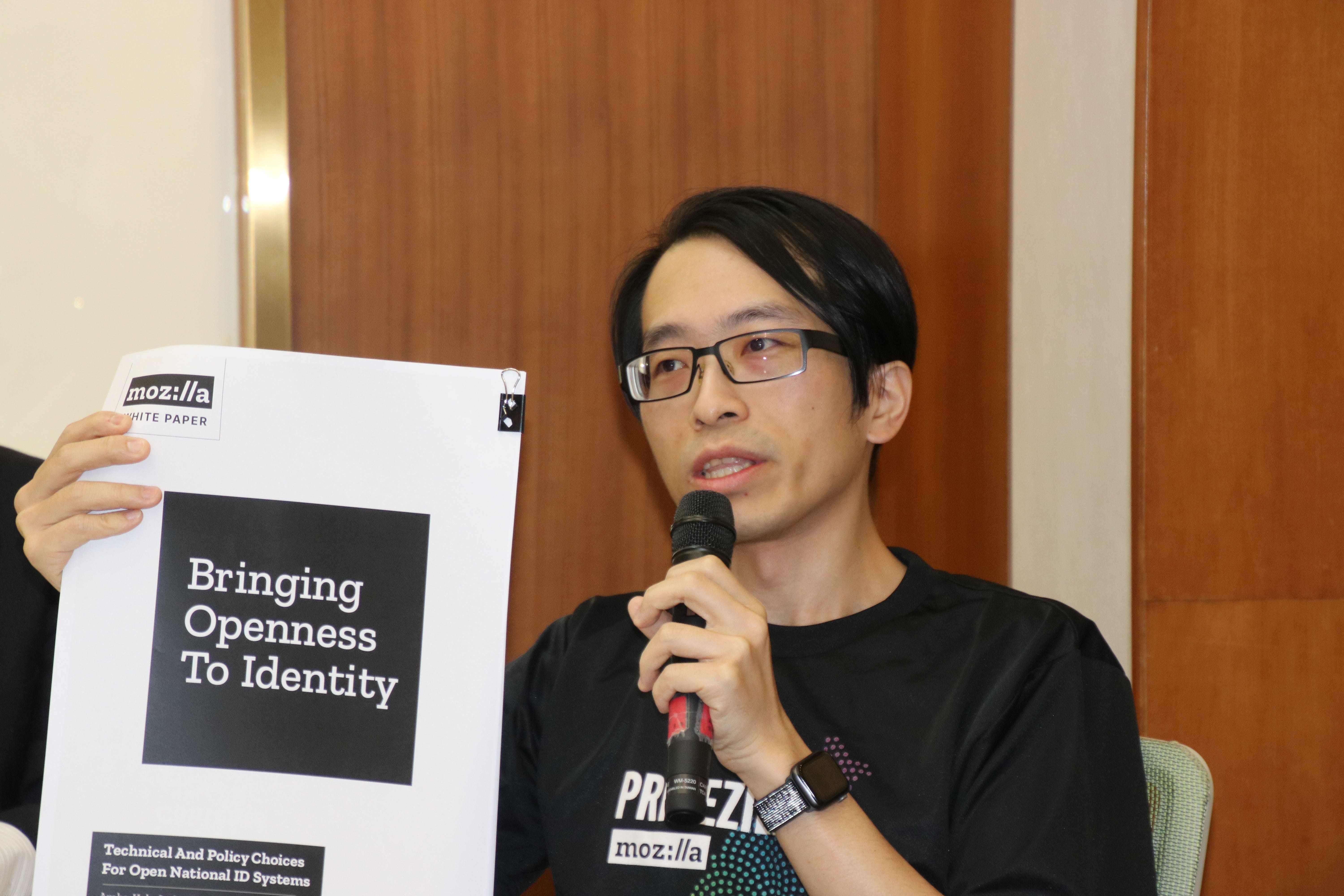 Mozilla 台灣社群志工聯絡人陳心一(Irvin Chen)則依據 Mozilla 今年甫發布的〈數位身分白皮書〉(Digital ID White Paper,)說明,Mozilla 針對數位身份系統連結資料庫產生的大規模監控風險提出警示,認為如欲建構國家級數位身份系統,政府應秉持以下五種開放態度:(1) 開放多重選擇(2)去中心化機制(3)公開課責制度(4)確保多元包容(5)透明與公開參與。