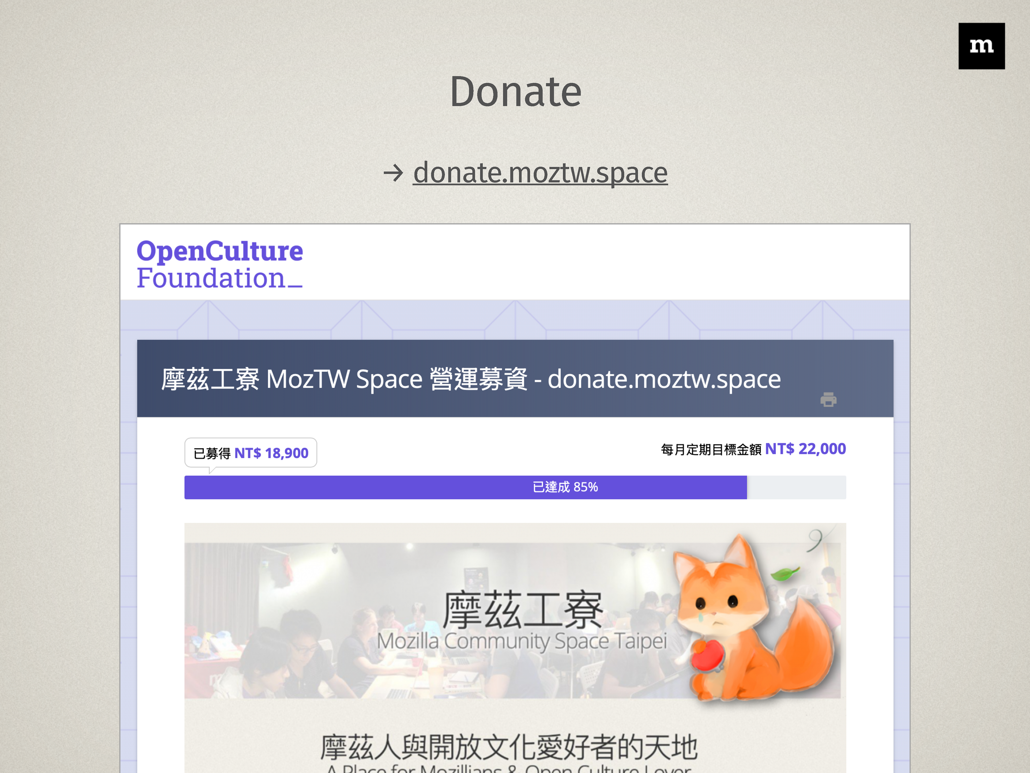 摩茲工寮 MozTW Space 營運募資 - donate.moztw.space - 財團法人開放文化基金會 *計畫說明摩茲工寮 MozTW Space 開放空間位於台北八德商圈,由 MozTW 台灣社群(moztw.org)志工們合力經營,是一個可容納約…*donate.moztw.space