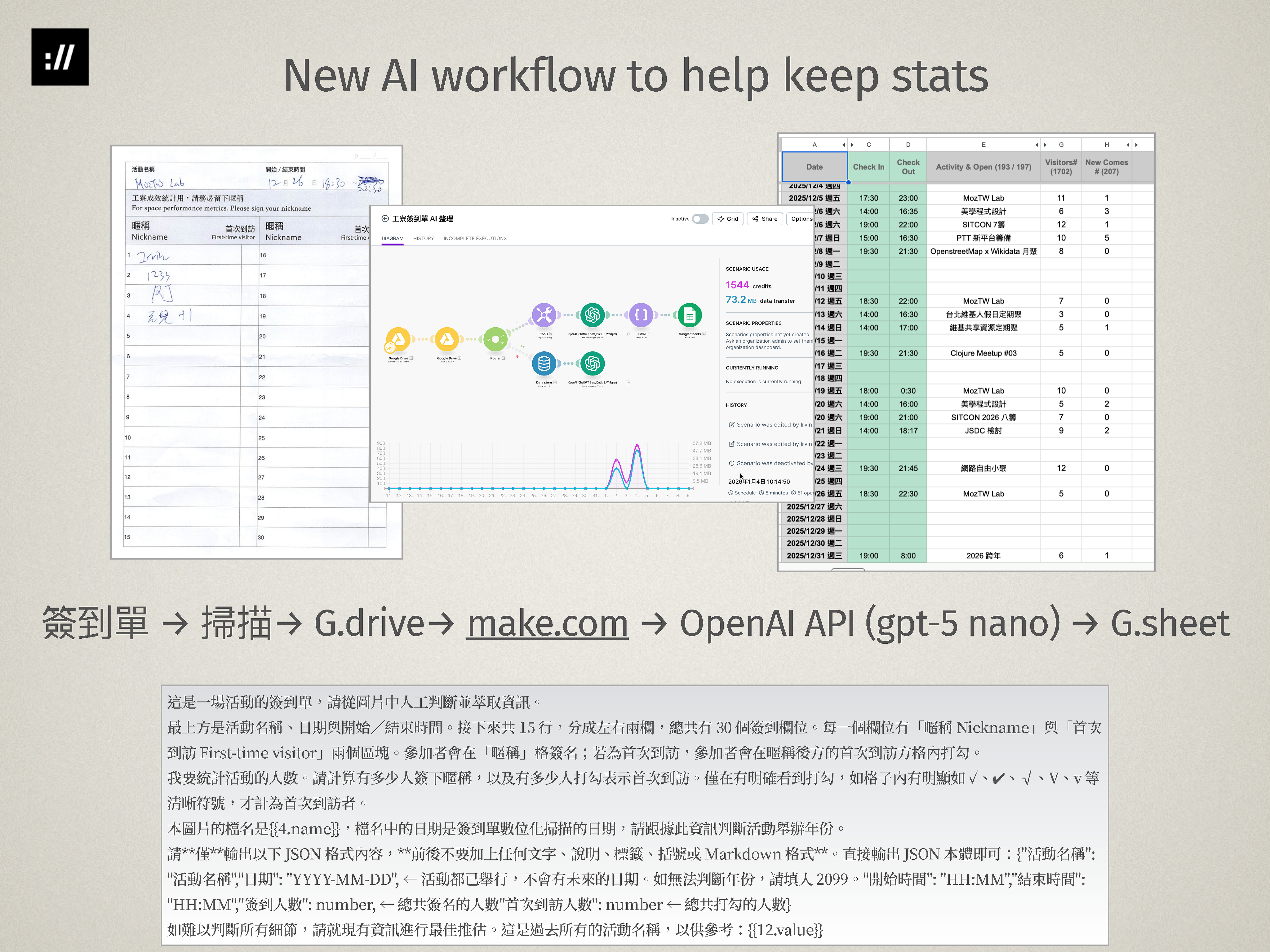 Starting this year, we make use of the following AI toolchain to save the time for manual typing: 1) scan the form and break into each image files, 2) save the file to Google Drive, 3) send the image to OpenAI API and save the event data to Google Sheets through make.com no-code tool, 4) manual review and correcting the data.