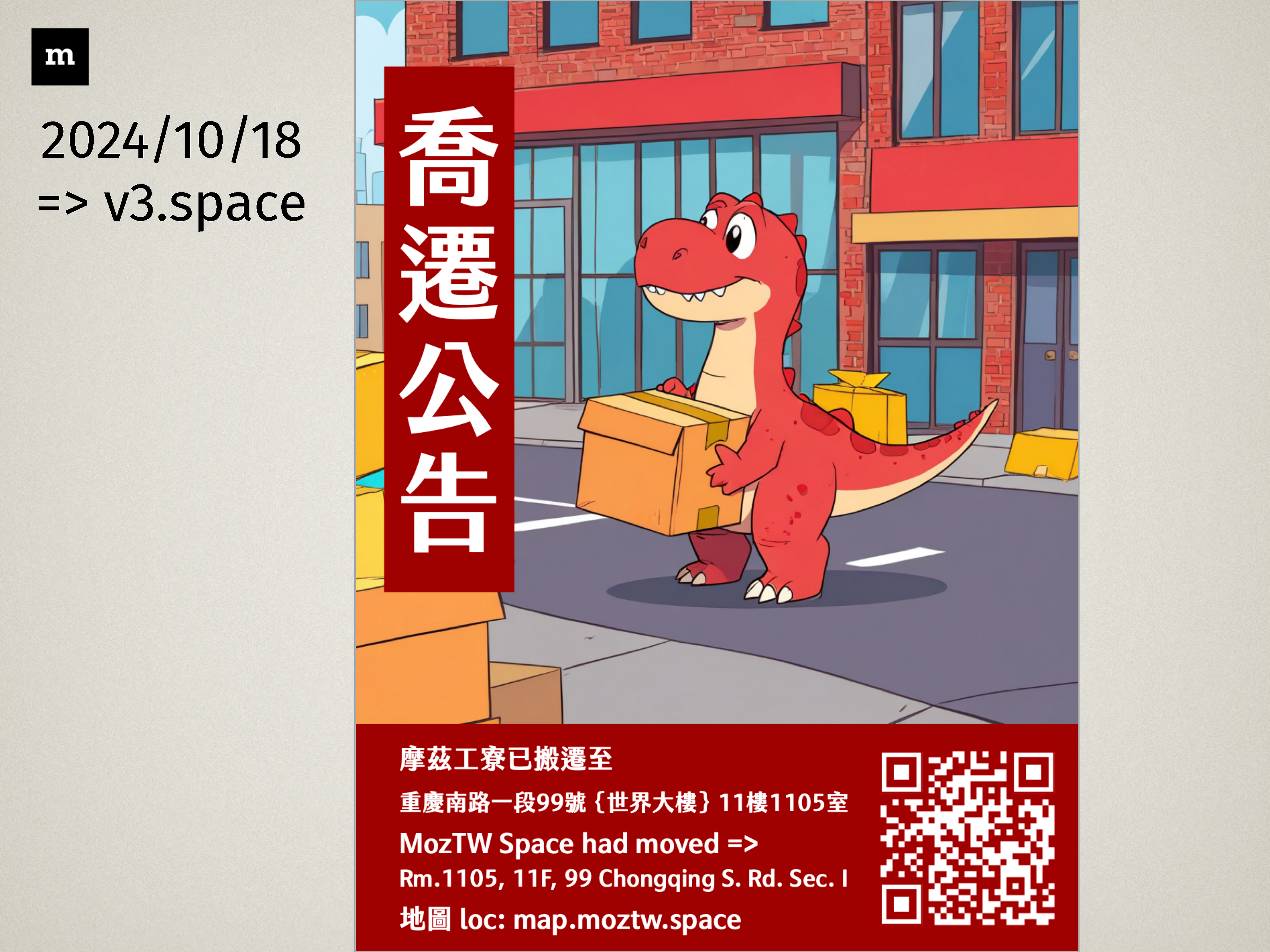第一代的摩茲工寮成立於北市中山區德惠街的 CLBC 地下室空間。2014 年 11 月搬移到八德路上,光華商場旁公寓三樓的第二代場地。十年後,我們再次於 2024/10 搬遷到重慶南路現址。