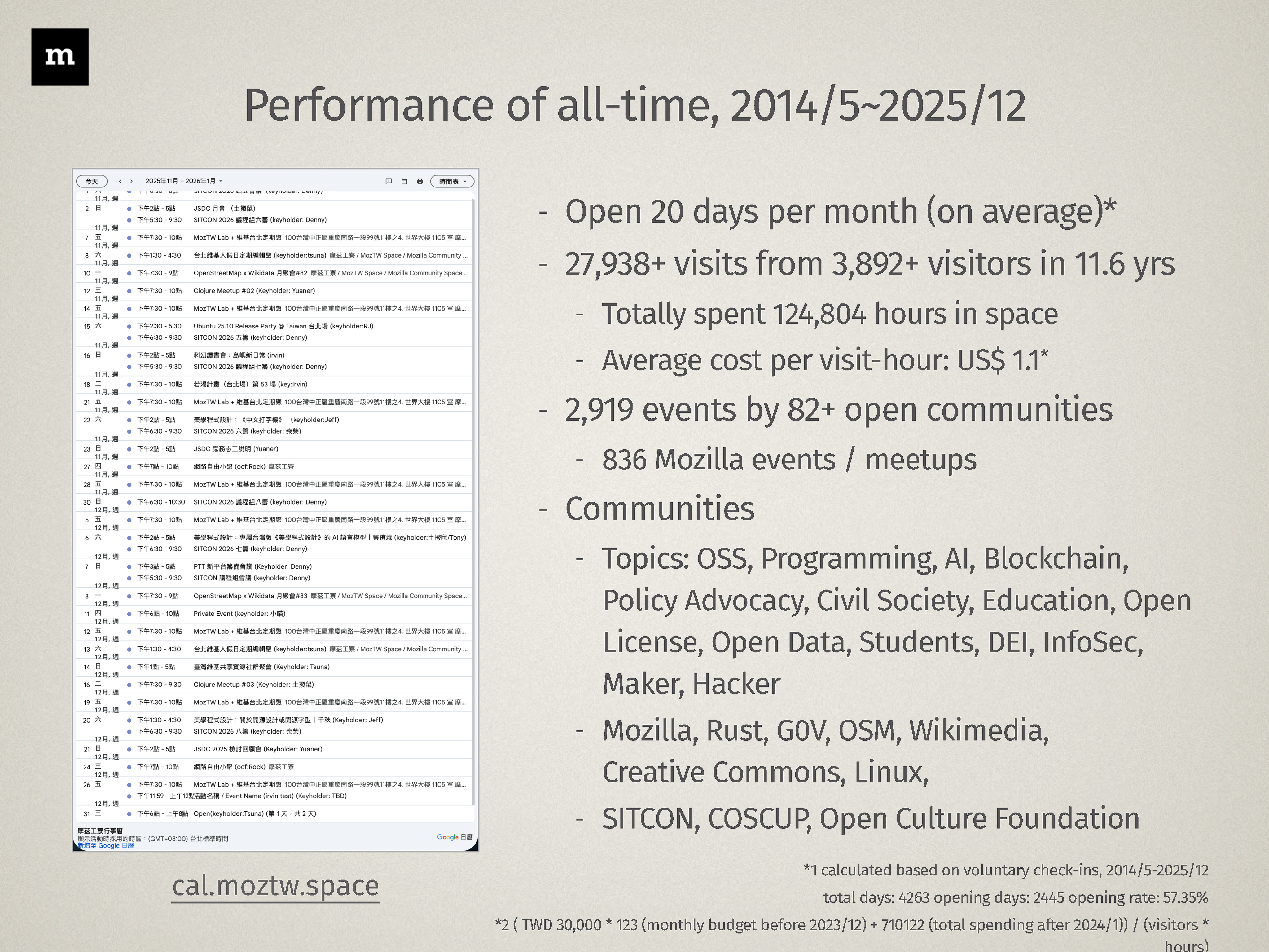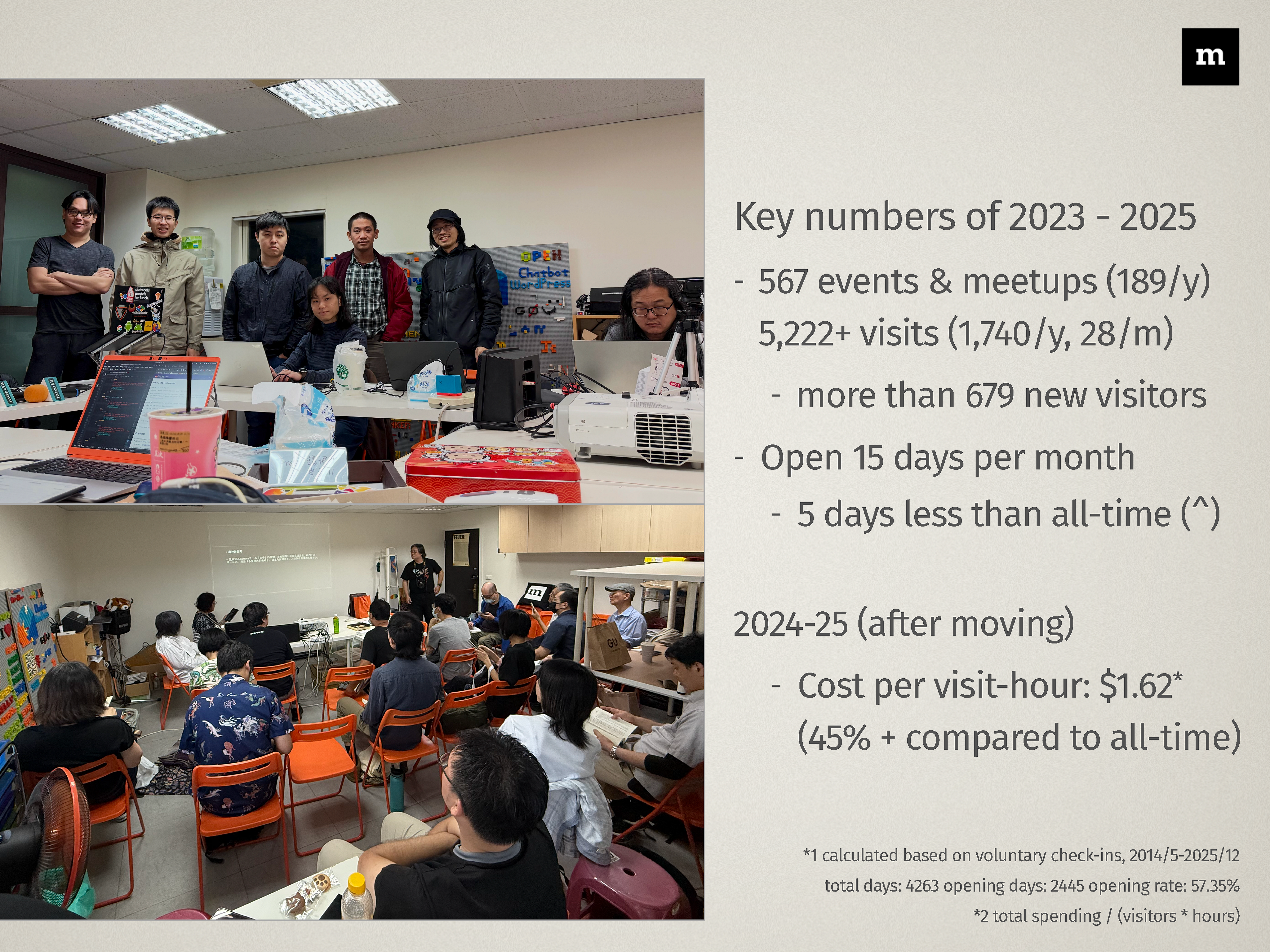 tl;dr 摩茲工寮在 2023~2025,三年間共有 567 場開放文化活動及聚會,合計超過 5,200 人次到訪,平均每月使用率為 15 天。自 2024 年起,空間由社群支持者小額資助,至今的財務結算為「負11萬元」。歡迎參考行事曆