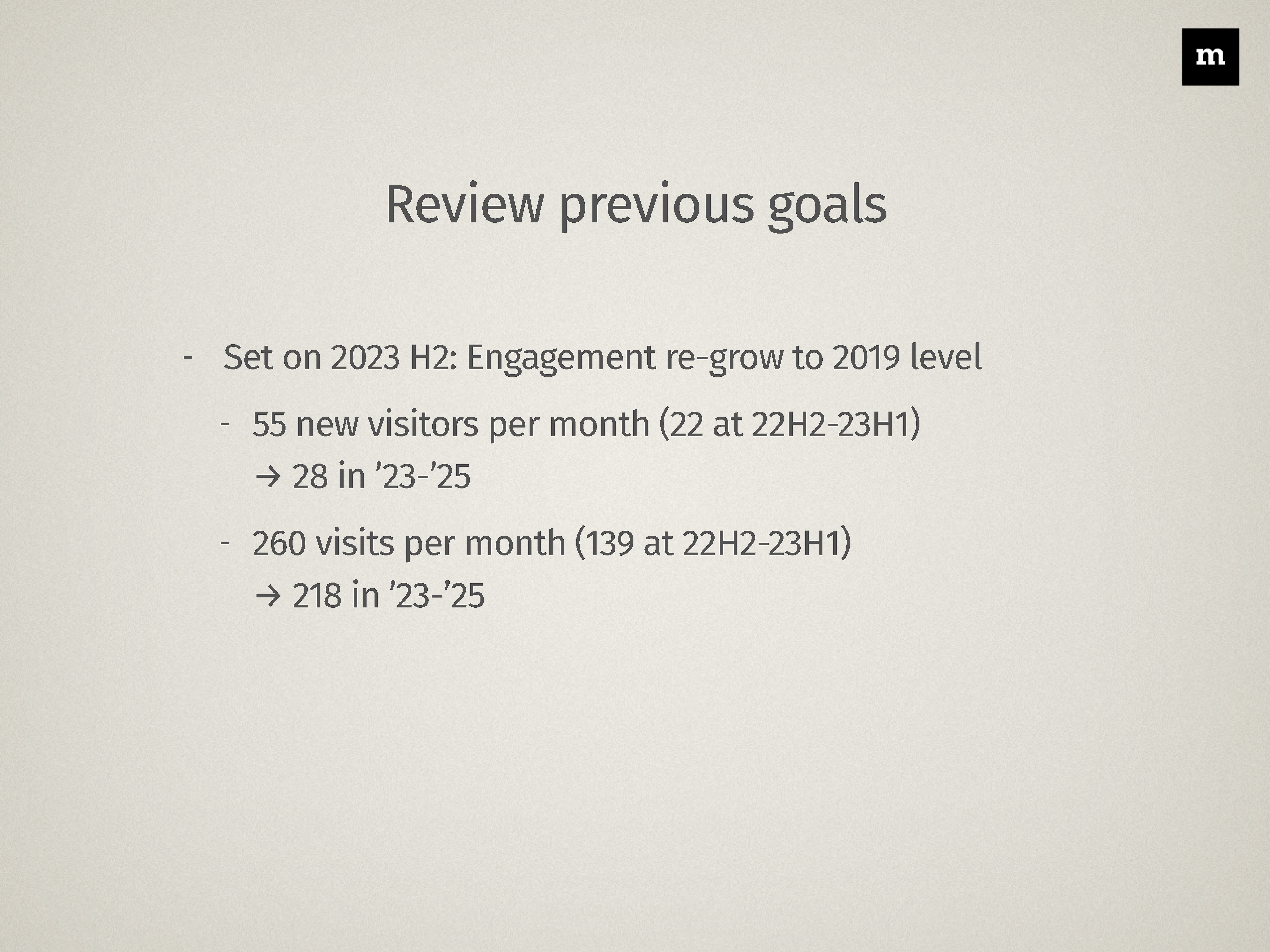 - Re-grow the engagement rate to pre-COVID level, which is 55 new visitors out of 260 visitors per month. → Monthly new visitors growing from 22 to 28, → and visits growing from 139 to 218 in 2023–25.