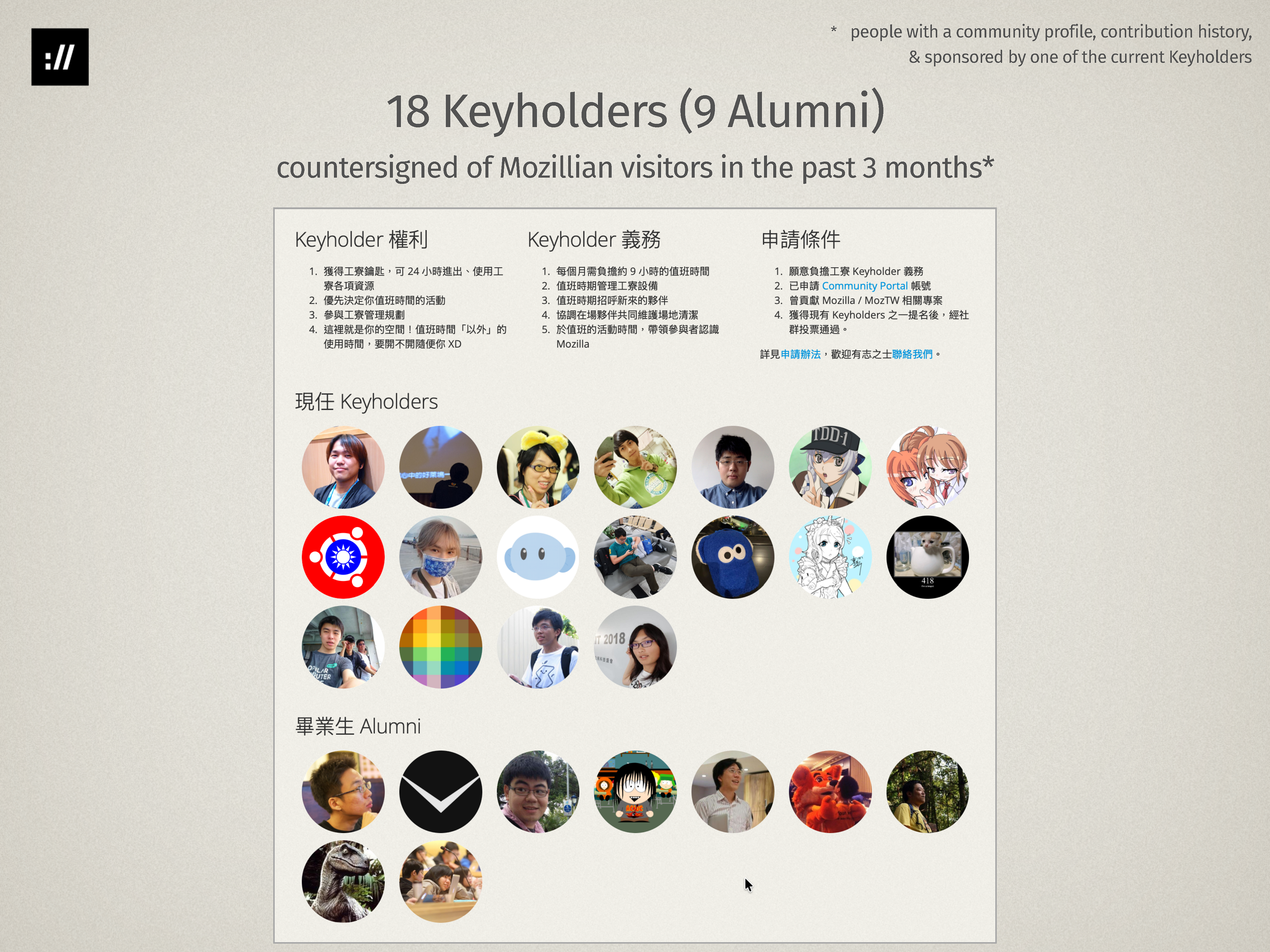 MozTW Space is co-managed by “Keyholders” — 18 local Mozillians, Mozilla volunteers. Keyholders are all vouched Mozillians, have the same privilege, and can freely use and sponsor the space for events of other communities.