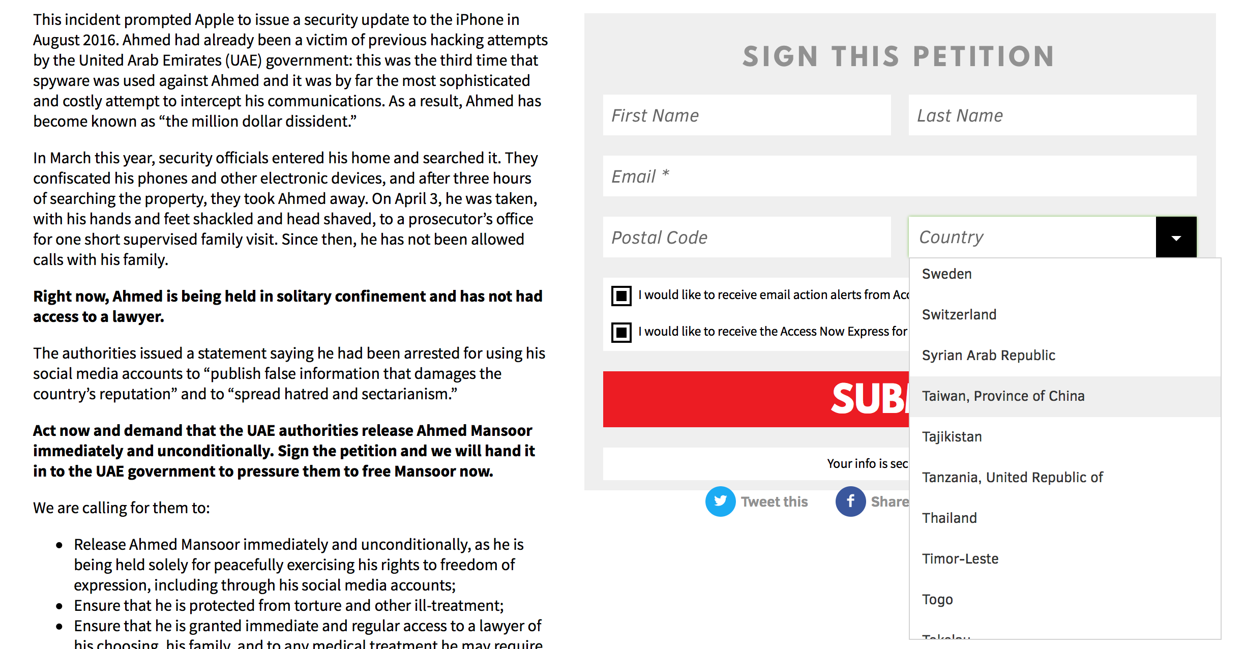 Recently I notice that Access Now wrongly list my country’s name as “Taiwan, Province of China” on the campaign page country drop-down list (eg., https://www.accessnow.org/campaign/free-ahmed-mansoor/). Please correct it and listing our country as “Taiwan” or “Taiwan (Republic of China)” (our formal name).