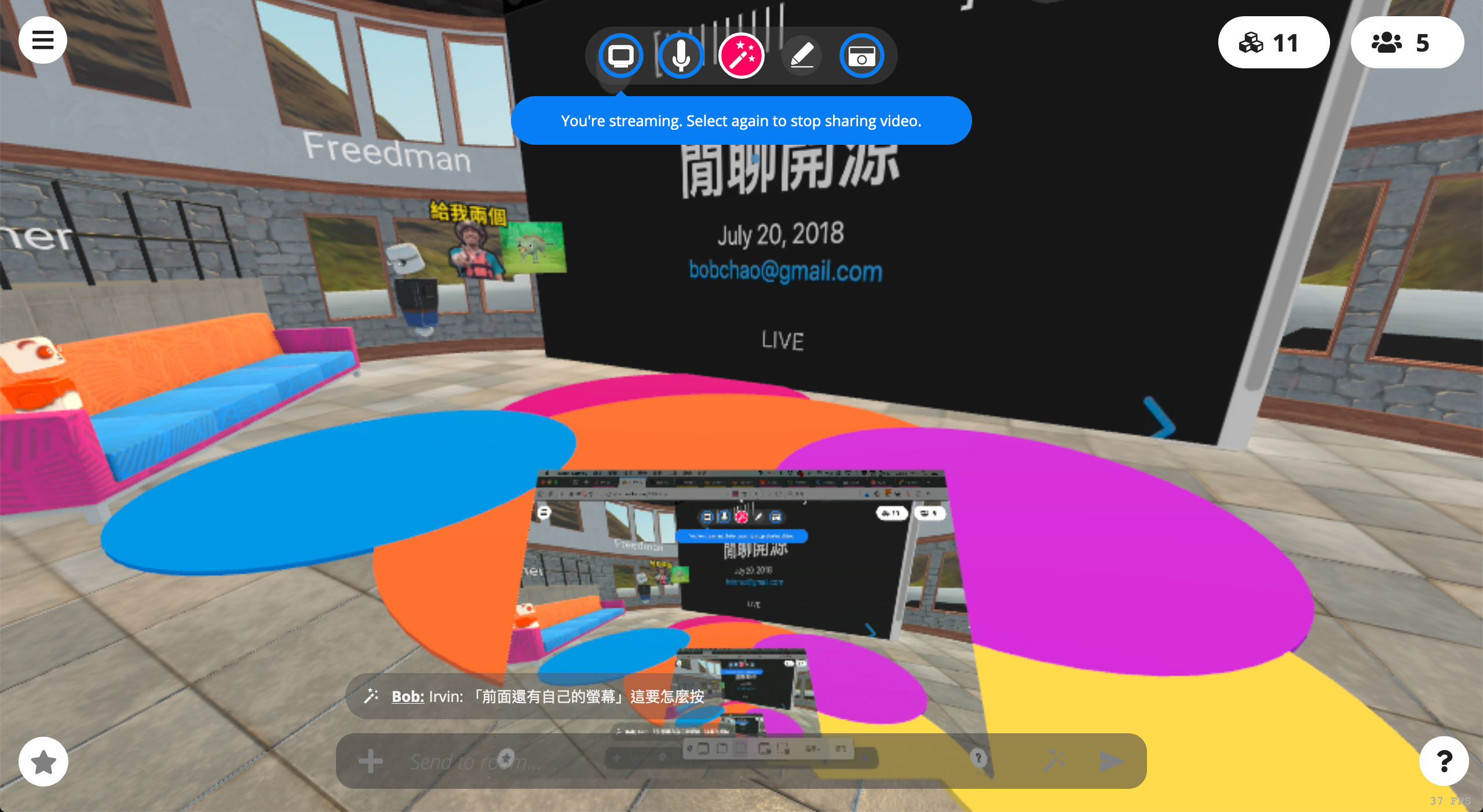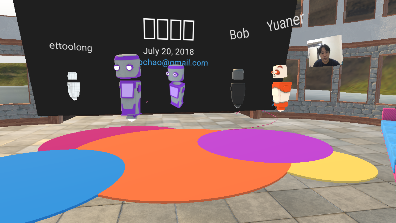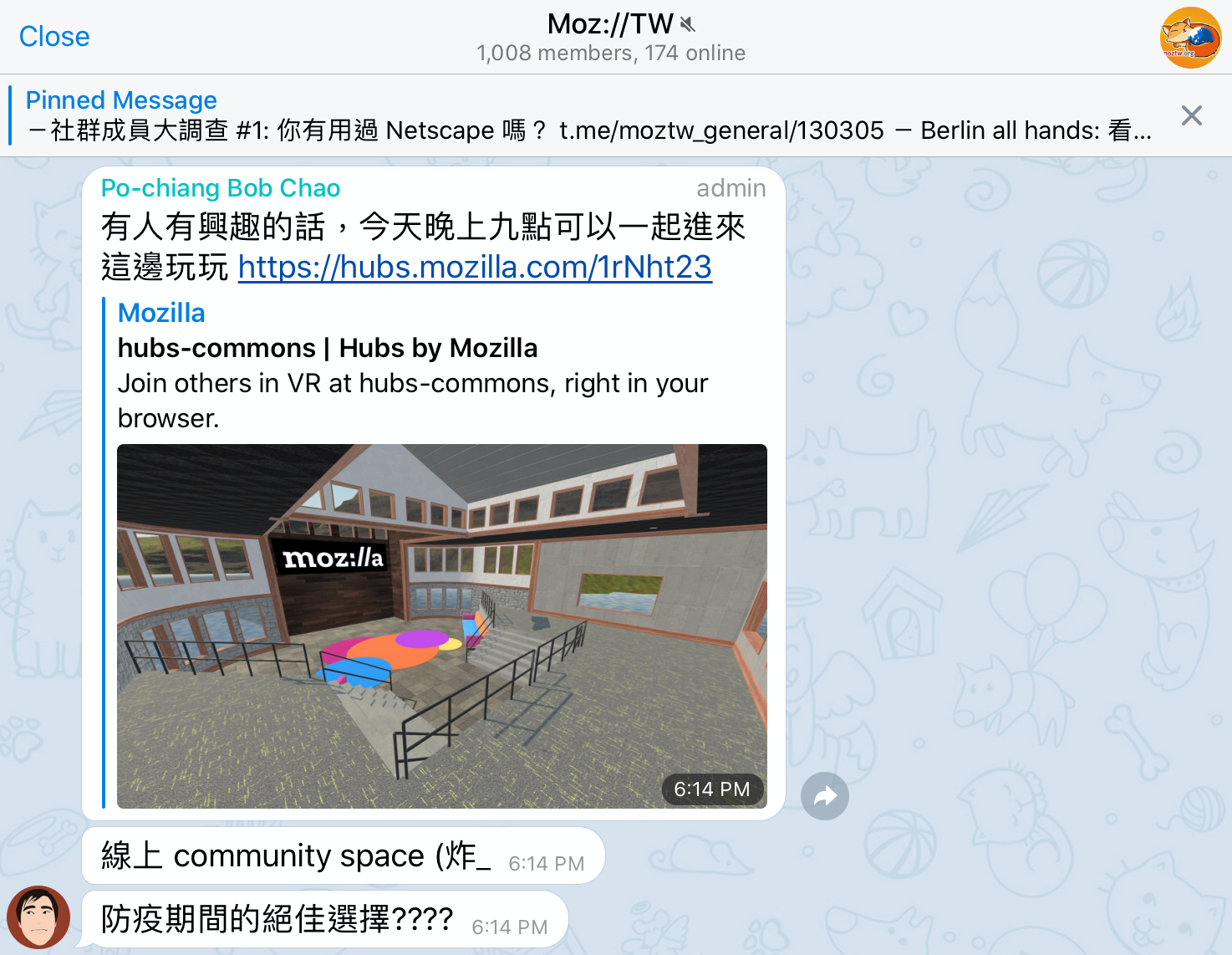 Po-chiang Chao suggested that we try hubs during the regular weekly meetup time, and shared the link on Telegram earlier. We connected to the room during our event at Taipei Community Space, and some community members joined from their homes.