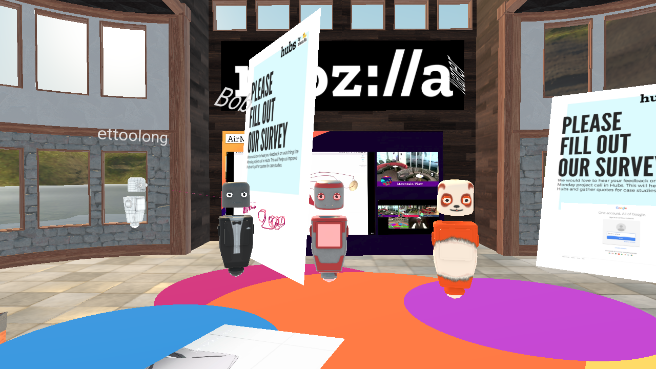 We all gather at the “Hubs Commons” room. People play with all the features, summit items, move things around, share webcams and screens, open YouTube, and add the browser window to the AirMozilla website (and not knowing how to surf with it).